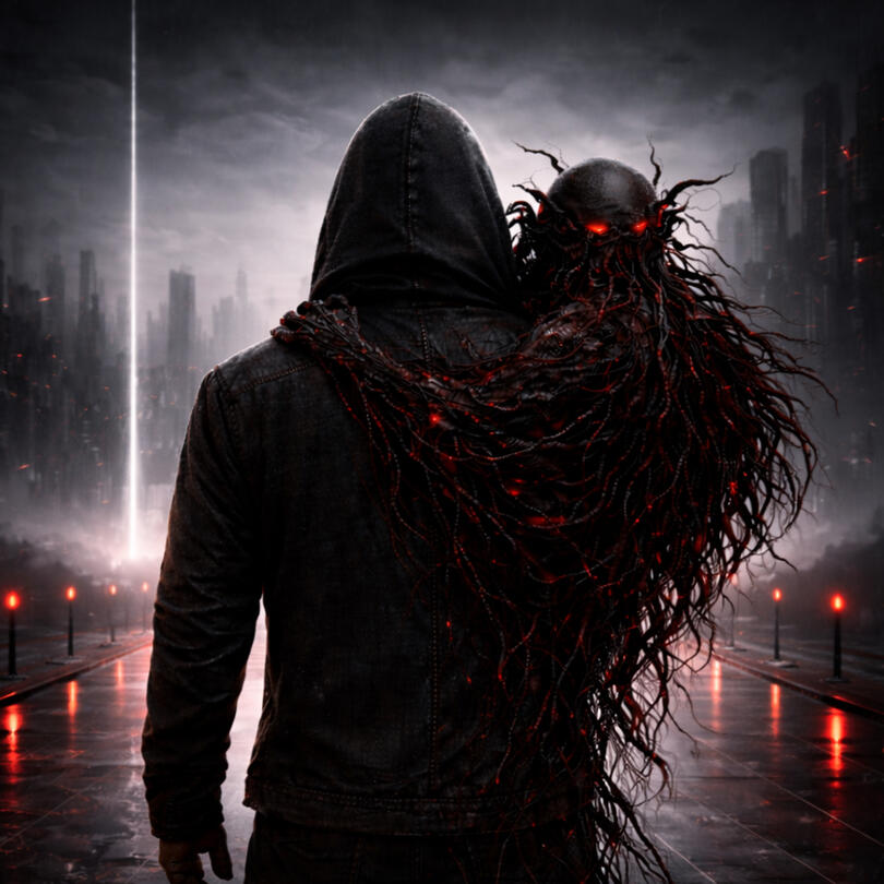 A young man walks alone down an empty street.From the very beginning, a small, black, goblin-like creature clings to the left side of his body